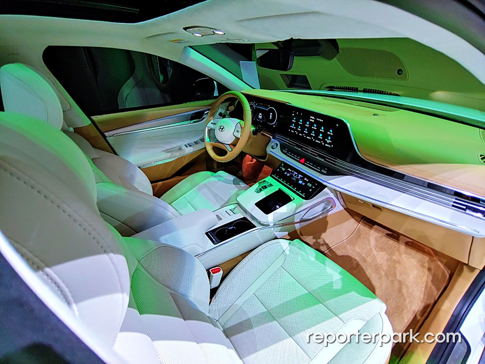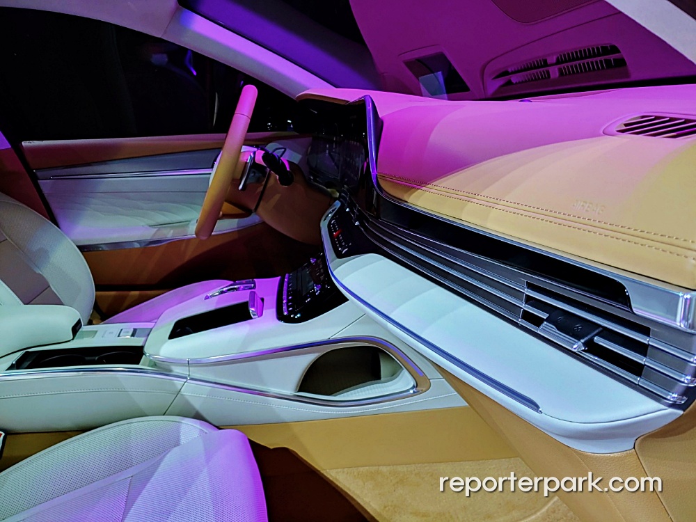 실내는 넓고 길게 뻗은 수평적 디자인을 적용했고 대시보드는 깊이 파놓지 않고 폭포처럼 직각으로 떨어지도록 디자인됐다. 다만 지루함을 덜기 위해 아래쪽에 장식과 엠비언트라이트를 더했다.
