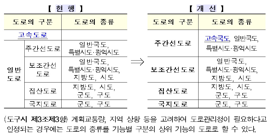 기존에는 고속도로와 일반도로로 구분해 설계 중이지만 앞으로는 도로의 기능별로 구분하도록 개선하고, 도로관리청이 필요할 경우 상위기능의 도로로 설계할 수 있게 했다.