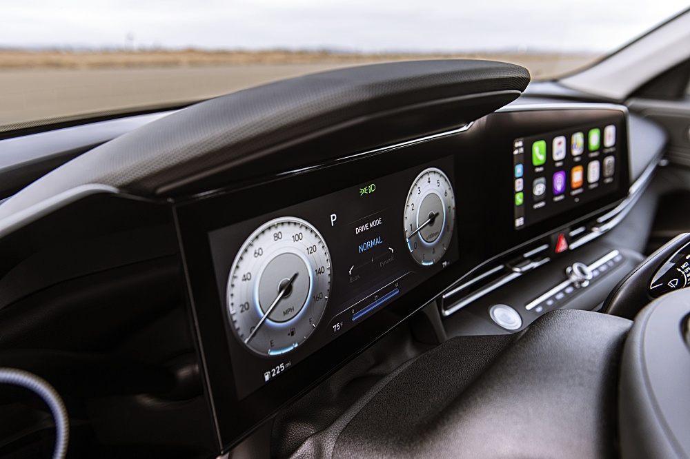 문에서 콘솔까지 연결되는 운전자 중심 구조는 낮고 넓으면서 운전자를 감싸 스포츠카처럼 스포티한 실내 공간을 구현했다. 10.25인치 풀 디지털 클러스터와 10.25인치 내비게이션이 연결된 파노라마 디스플레이는 신형 그랜저의 것보다 한결 자연스럽다.