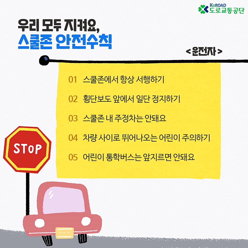 어린이가 주정차된 차 사이로 뛰어나올 수 있는 만큼 스쿨존에서 불법 주정차는 절대 금물. 아울러 운전자는 차 사이로 어린이가 뛰어나올 수 있음을 항상 인지해야 하며 통행 시 어린이 통학버스를 앞질러선 안된다.