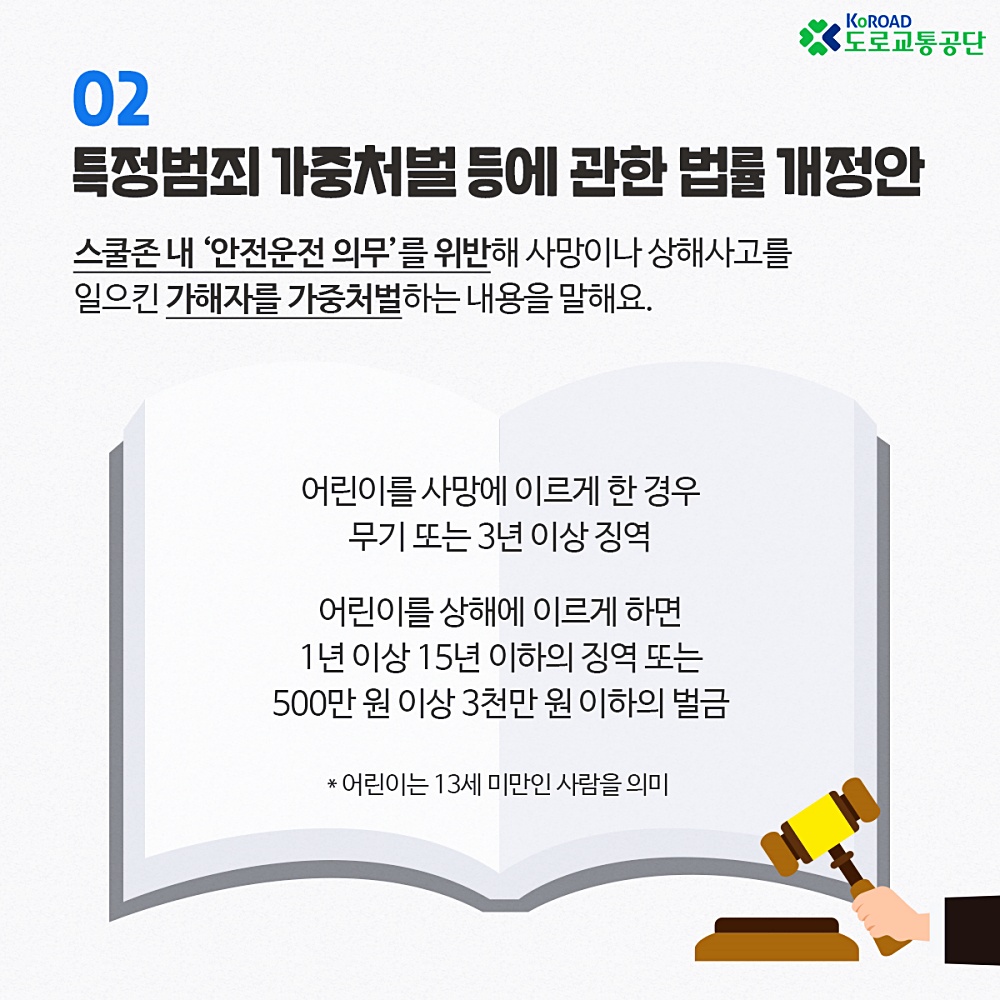 특정범죄가중처벌법에서는 어린이보호구역 내 교통사고의 54%가 운전자의 '안전운전 의무 불이행'임을 고려, 운전자가 이를 위반한 경우 가중처벌하도록 개정했다.