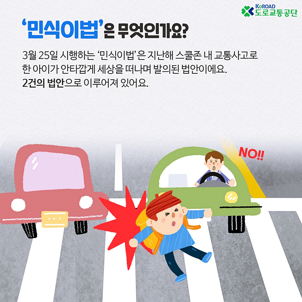 23일 도로교통공단에 따르면 새로 시행되는 민식이법은 어린이보호구역(스쿨존) 내 교통사고 가해자에 대한 처벌을 강화하는 것을 골자로 한다. 이에 스쿨존 안전을 강화하기 위한 것인 만큼 도로교통법 개정안과 특정범죄 가중처벌 등에 관한 법률 개정안으로 이뤄졌다.