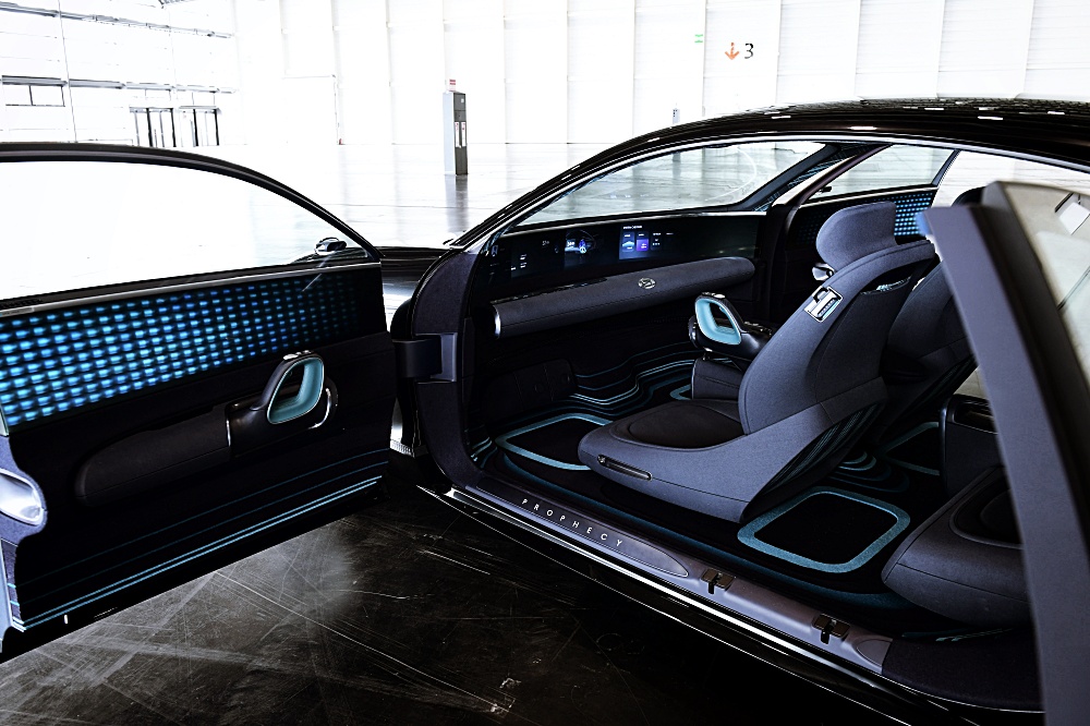 프로페시의 두번째 포인트는 독특한 스티어링 메커니즘이다. 인테리어는 보다 넓은 공간감과 편안함을 전달하기 위해 인간공학적으로 설계됐다. 운전자 앞에 자리하던 운전대가 사라진 대신 두개 조이스틱이 양쪽에 설치됐다. 하나는 센터콘솔에 있고, 다른 하나는 도어 트림에 있다. 편안한 자세를 유지하면서도 두 조이스틱으로 90%가량의 기능을 컨트롤 할 수 있다고 한다.