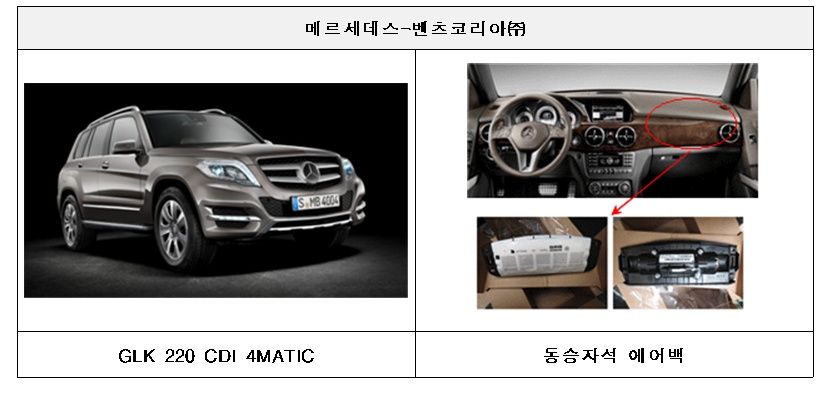 GLK 220 CDI 4MATIC 등 12개 차종 8163대는 에어백(다카타 사) 전개 시 인플레이터의 과도한 폭발압력으로 발생한 내부 부품의 금속 파편이 운전자 등에게 상해를 입힐 가능성이 확인돼 리콜한다.