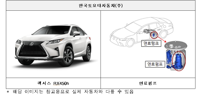 한국토요타자동차에서 수입, 판매한 렉서스 RX450h 등 23개 차종 4,686대는 연료펌프 내 일부 부품(임펠러)의 결함으로 연료펌프가 작동되지 않아 주행 중 시동이 꺼질 가능성이 확인돼 리콜한다.