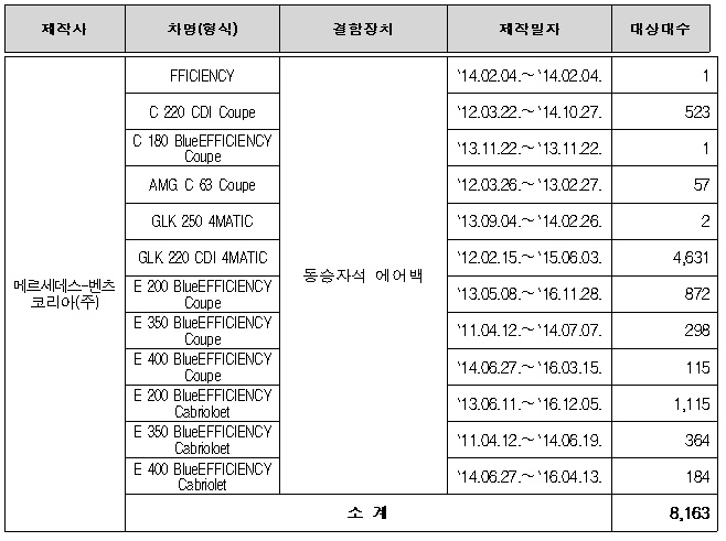 GLK 220 CDI 4MATIC 등 12개 차종 8163대는 에어백(다카타 사) 전개 시 인플레이터의 과도한 폭발압력으로 발생한 내부 부품의 금속 파편이 운전자 등에게 상해를 입힐 가능성이 확인돼 리콜한다.