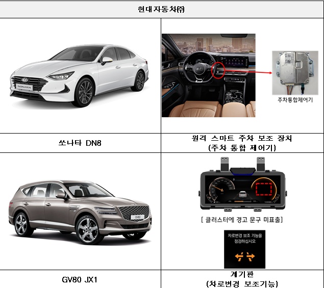 먼저 2019년 3월4일부터 2020년 3월23일까지 생산된 현대자동차의 쏘나타(DN8) 2만2415대, 2019년 11월6일부터 2020년 3월7일까지 생산된 그랜저 IG(페이스리프트) 1941대, 2020년 1월7일부터 2월18일까지 생산된 제네시스 GV80(JX1) 757대 등 3개 차종 2만5113대와 2019년 11월18일부터 2020년 2월11일까지 생산된 기아자동차의 K5(DL3) 3758대는 원격 스마트 주차 보조(RSPA) 장치의 소프트웨어 오류로 원격 주차 시 간헐적으로 제동 제어가 되지 않아 사고가 발생할 가능성이 확인됐다.