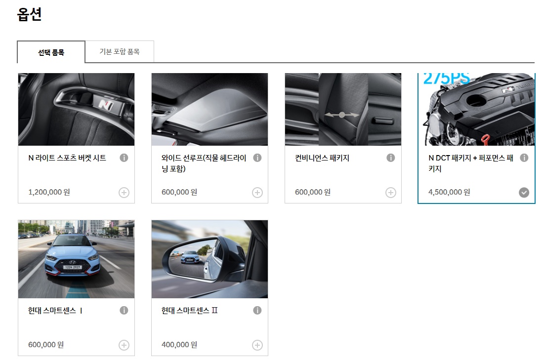 선택품목을 추가하면 가격이 더 올라간다. 알칸타라와 N 조명이 특징인 N 라이트 스포츠 버켓 시트는 120만원, 와이드 선루프는 60만원, 차로 유지 보조, 운전자 주의 경고, 하이빔 보조, 전방 충돌방지 보조, 차로 이탈방지 보조가 포함된 현대스마트센스I은 60만원, 후측방 충돌경고와 후방 교차 충돌 경고가 포함된 현대스마트센스II는 40만원이 추가된다. 다만 N 라이트 스포츠 버켓 시트와 컨비니언스패키지(60만원)를 중복 선택할 순 없다.